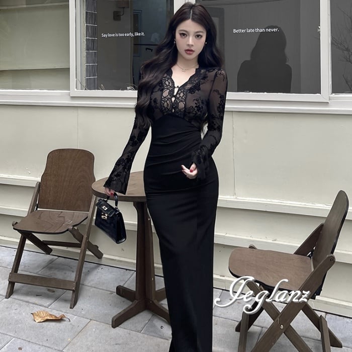 パーティ マキシ ワンピース ドレス 異素材 レース バック スリット (M9084)ζ