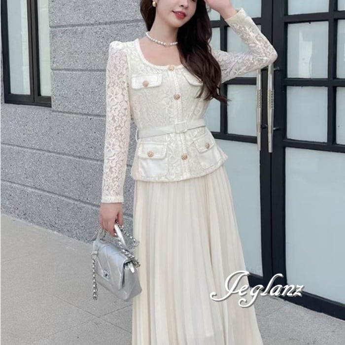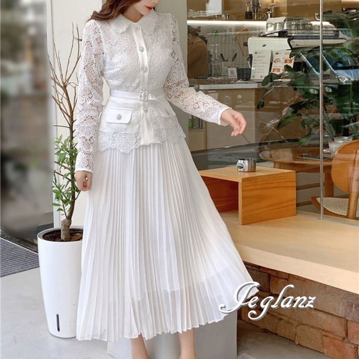フェイクワンピース 刺繍 レース 異素材 プリーツ スカート 2色(M9106)γα